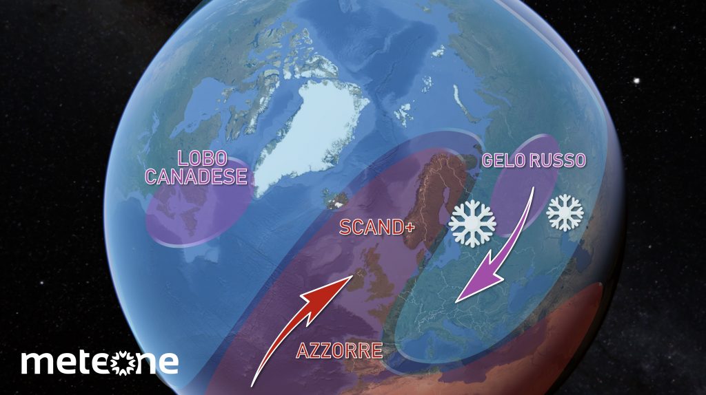 Contestualmente l’afflusso di aria molto fredda tra Russia e nord Europa favorirà la formazione di un anticiclone termico: sarà il preludio alla genesi di un’alta pressione sulla Scandinavia (SCAND+), fondamentale per la successiva dinamica.