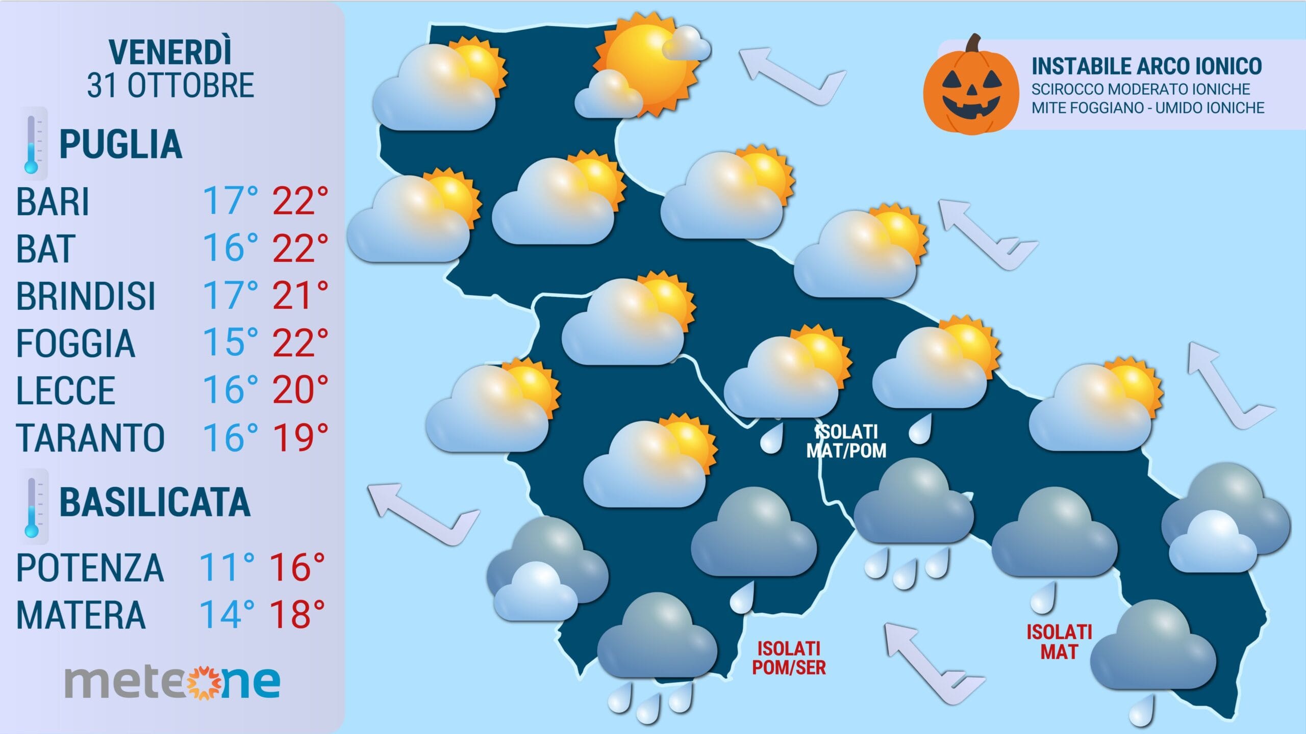 Situazione generale: si isolerà una debole circolazione depressionaria sul basso Mediterraneo. Questa influenzerà marginalmente i settori ionici e il Salento con rovesci isolati e cieli nuvolosi. Clima mite sul foggiano, umido e ventoso soprattutto sul versante ionico.