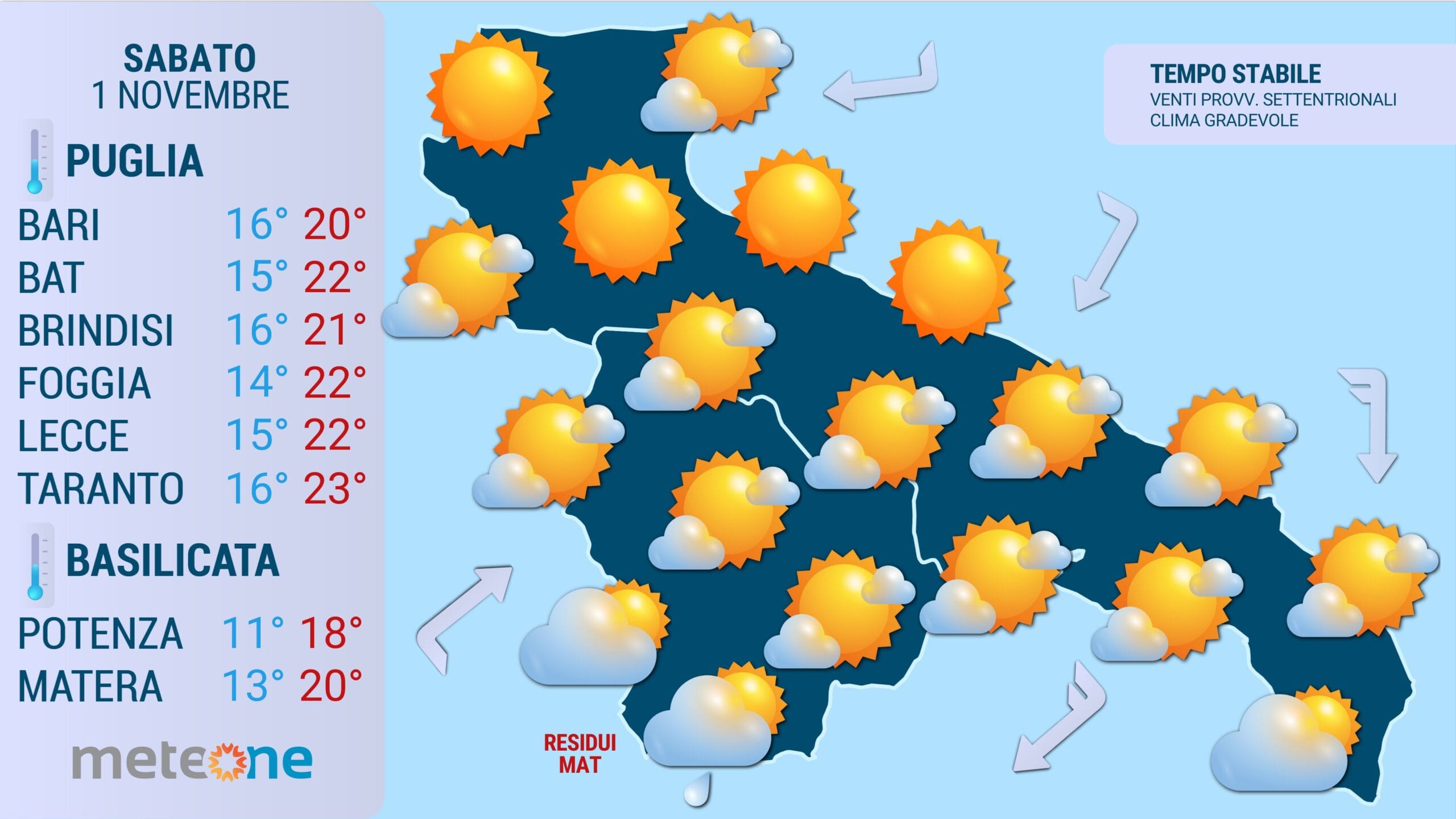 Nuvolosità sparsa sui settori centro-meridionali. Rovesci isolati tra metapontino e basso potentino. Bello sul foggiano e BAT.