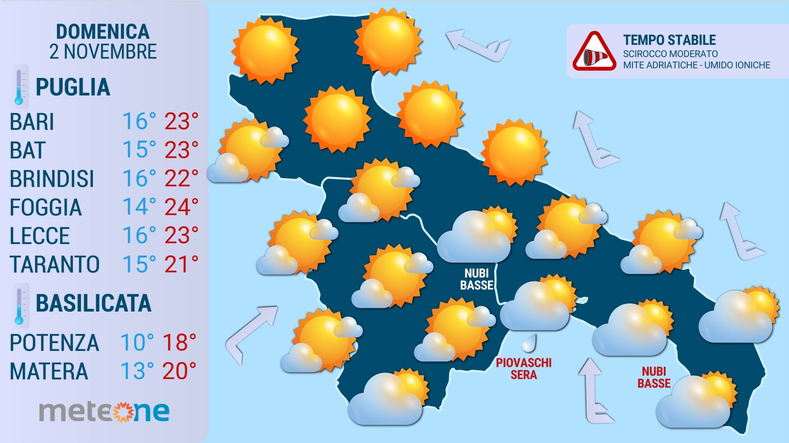 Scirocco moderato sul Salento e lungo i settori adriatici. Deboli di libeccio sui settori occidentali e Monti Dauni. In serata si indeboliranno provvisoriamente ovunque.