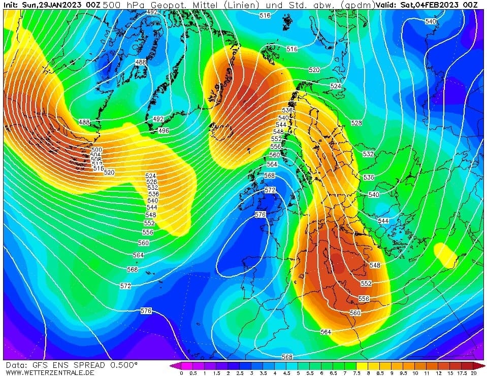 Emblematica la mappa che mostra lo spread (la forbice previsionale) del modello ensemble gefs che aggiunge una “perturbazione”, cioè una differenza negativa o positiva, ai dati iniziali. Il modello viene poi elaborato 30 volte per ottenere 30 visioni diverse dello stesso. Perchè? I dati iniziali inseriti in un modello hanno errori o dati mancanti, quindi gli ensemble suppliscono a questa mancanza, introducendo una “correzione”.
