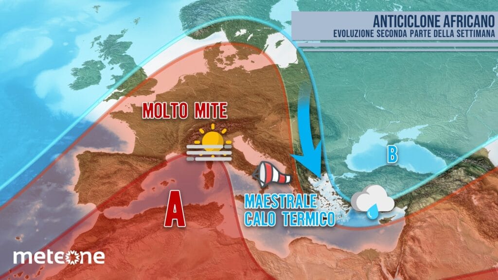 L’anticiclone resterà padrone dell’Italia, ma si indebolirà sul suo fianco orientale permettendo l’infiltrazione di aria più fresca al sud.