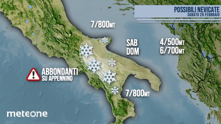 Le probabilità più alte per nevicate e accumuli sono sull’altamurgia (quindi zona centro-settentrionale della fascia murgiana) a partire dai 400-600m di quota. Nevicate coreografiche, accumuli deboli, localmente moderati a partire dai 600m.