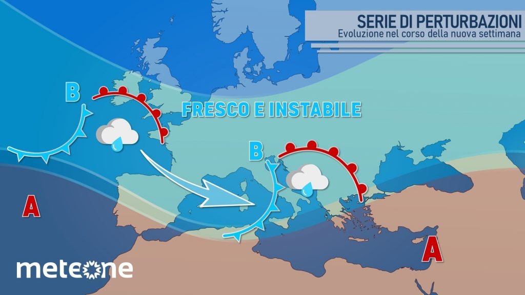 La nuova settimana sarà infatti segnata dall’arrivo di una serie di perturbazioni nord-atlantiche che rinnoveranno condizioni meteo instabili con correnti occidentali più fresche rispetto all’ultima settimana.