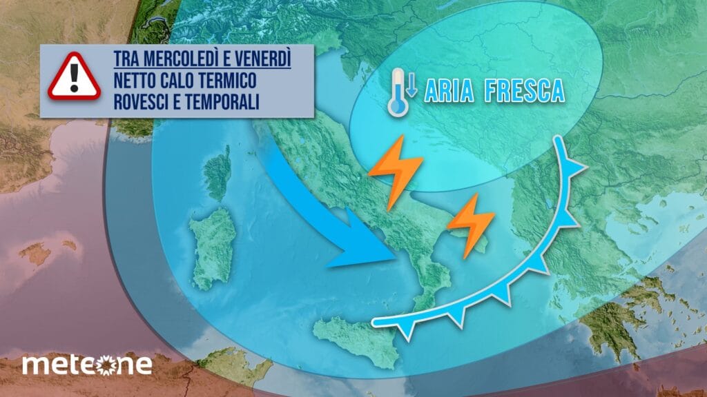 L’arrivo di aria più fresca e la rotazione dei venti dai quadranti settentrionali (tramontana/maestrale) determineranno una sensibile diminuzione delle temperature su tutto il sud e anche sulle nostre regioni con valori che si porteranno provvisoriamente sotto la media stagionale (solo venerdì). Saranno anche possibili fenomeni violenti localizzati come grandinate, colpi di vento e intensa attività elettrica.