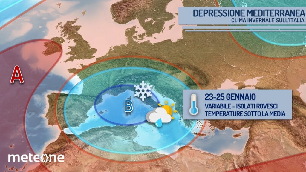 Italia sotto lo scacco di una vasta area depressionaria: al sud temperature sotto la media e possibili nuove nevicate sui rilievi appenninici.
