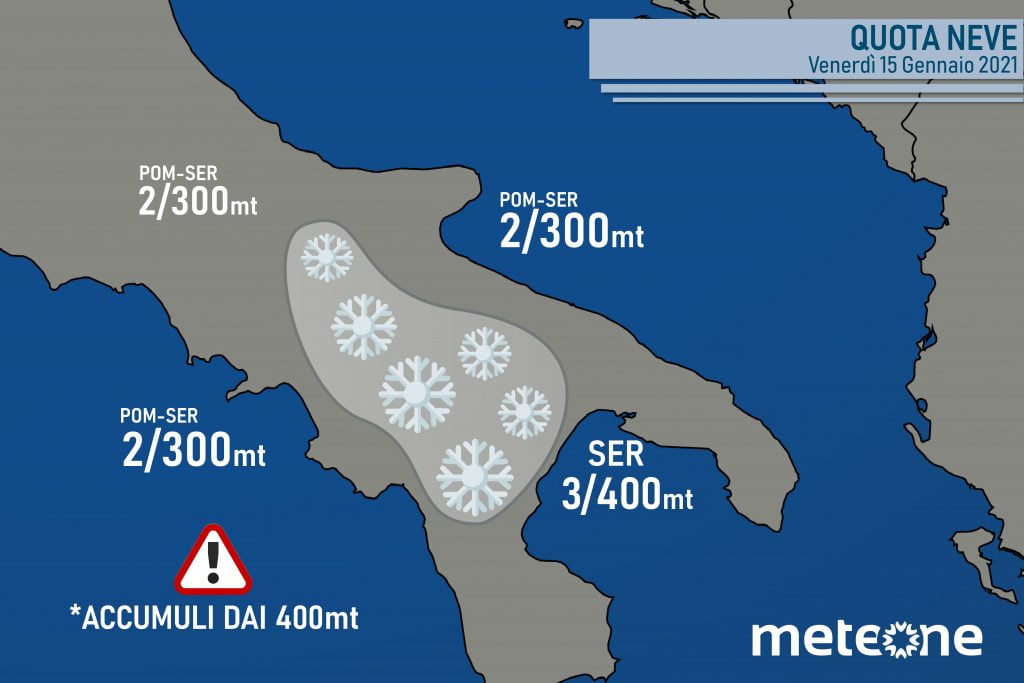 La formazione e lo scivolamento verso sud-est di un minimo depressionario sul mar Tirreno determinerà un peggioramento tra pomeriggio e sera, nevoso fino a quote molto basse. Le precipitazioni interesseranno la Basilicata, soprattutto il potentino, e in parte anche la Puglia con in pole le zone più intere di foggiano, bat e barese.