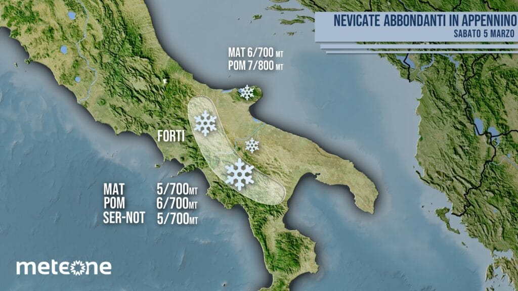Minimo depressionario in spostamento verso lo Ionio. Intense precipitazioni, nevicate abbondanti in Appennino e fiocchi fino media collina