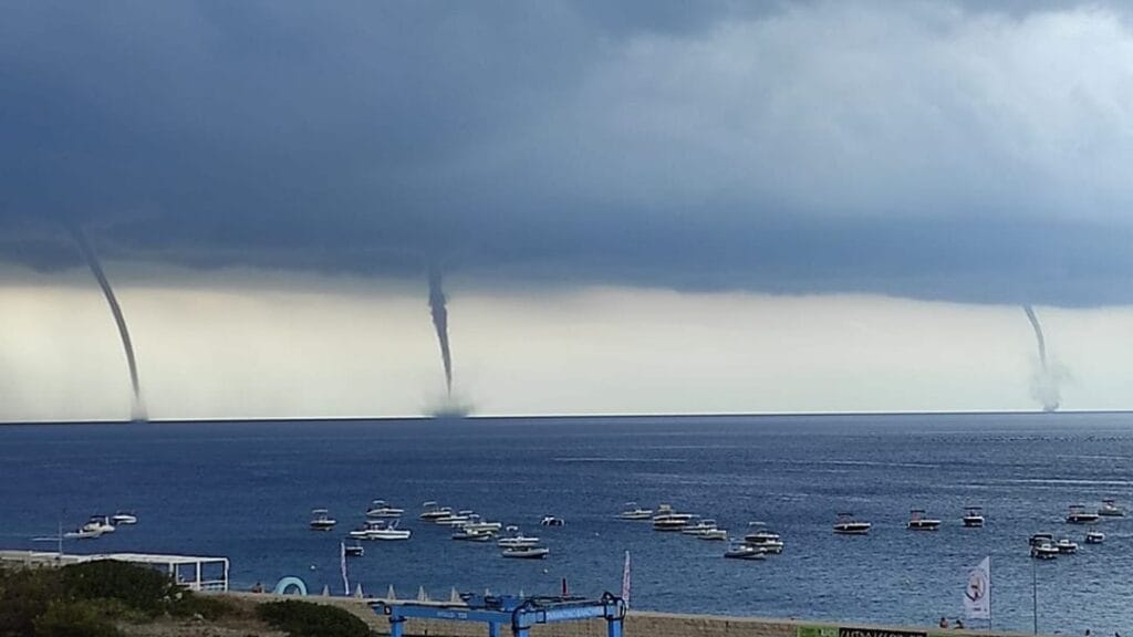 Il primo episodio significativo si è verificato al largo delle coste tra Castro e Santa Cesarea Terme, dove sono state avvistate e fotografate tre trombe marine simultaneamente. Questi vortici, seppur ben visibili, si trovavano a una distanza considerevole dalla riva e appartenevano alla categoria delle waterspout, trombe marine non mesocicloniche. Questo tipo di tromba marina, più comune nelle acque calde e in condizioni di bassa intensità temporalesca, tende ad essere meno potente rispetto a quelle mesocicloniche, ma può comunque costituire un pericolo per la navigazione e per chi si trova in mare.